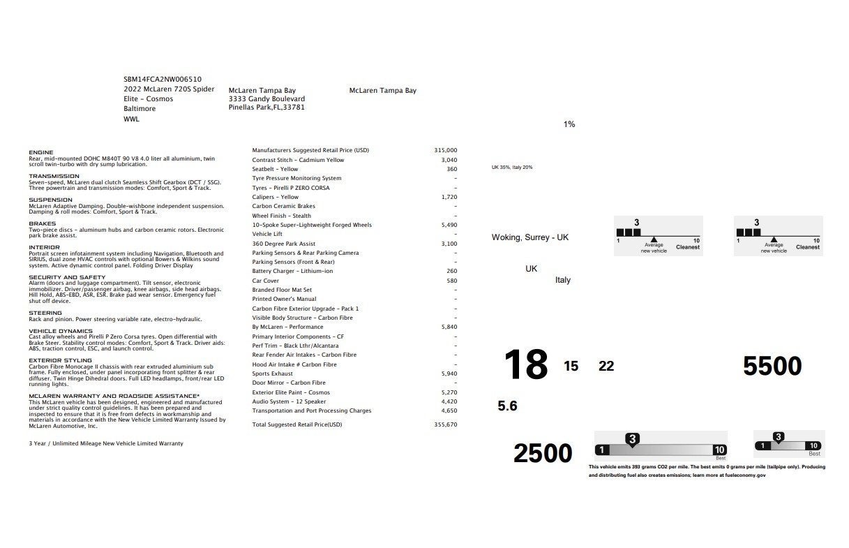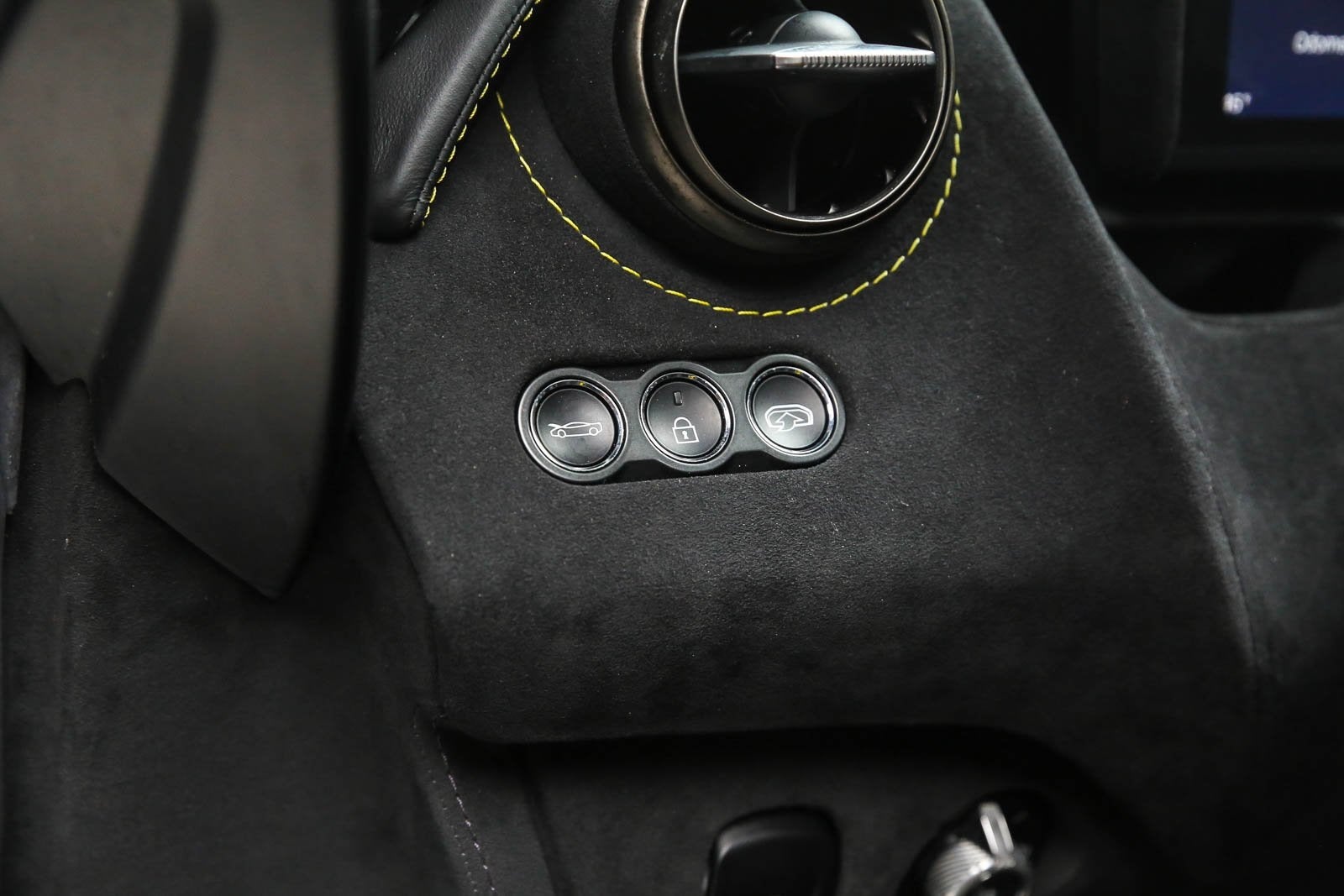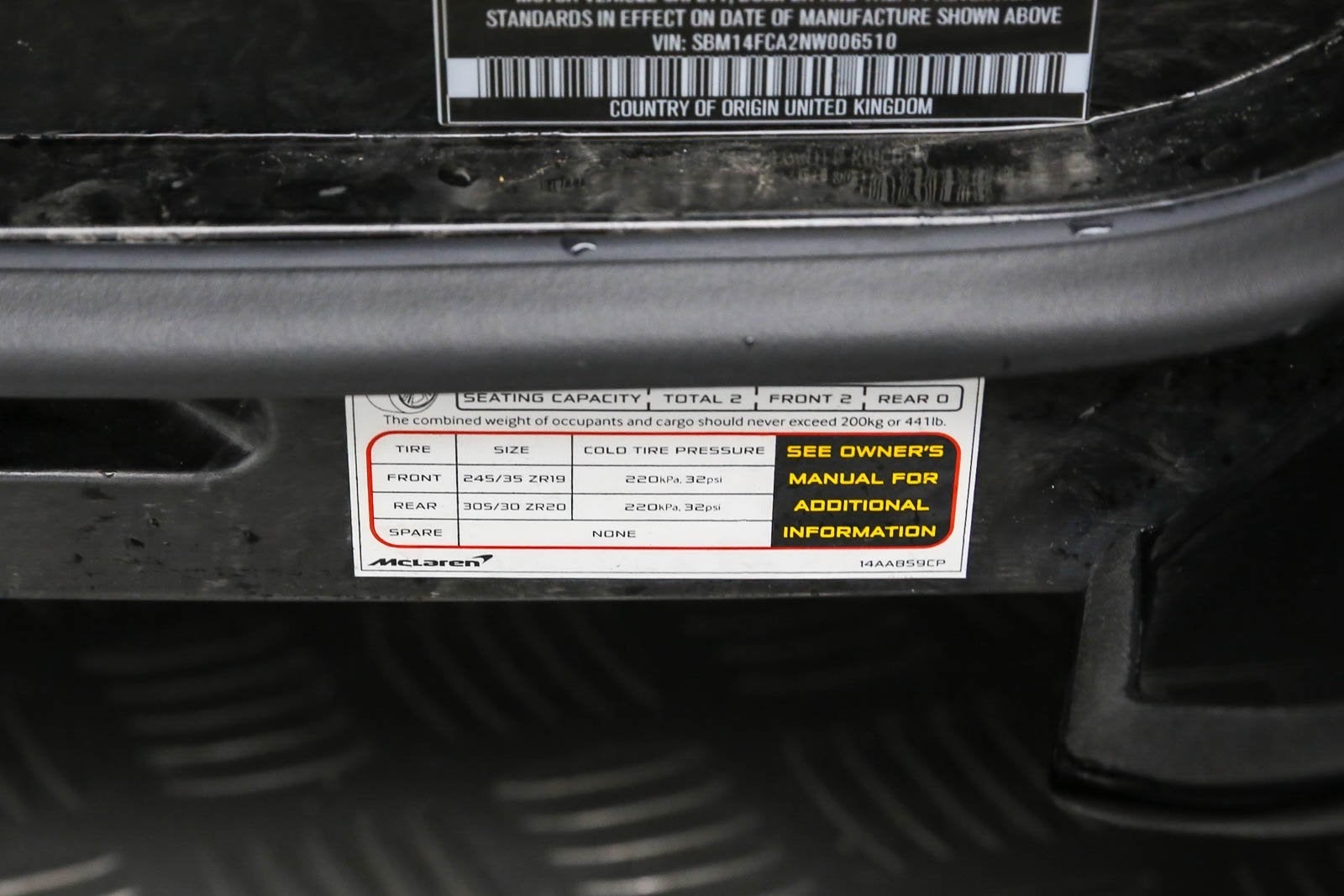 - Radio: AM/FM -inc: Sistema de infoentretenimiento McLaren (MIS), monitor con pantalla táctil de alta resolución de 8", sistema de audio McLaren de 4 altavoces, reproductor multimedia de audio, telefonía Bluetooth®, conectividad USB (2), entrada auxiliar, integración iPod/iPhone y control por voz para infoentretenimiento.